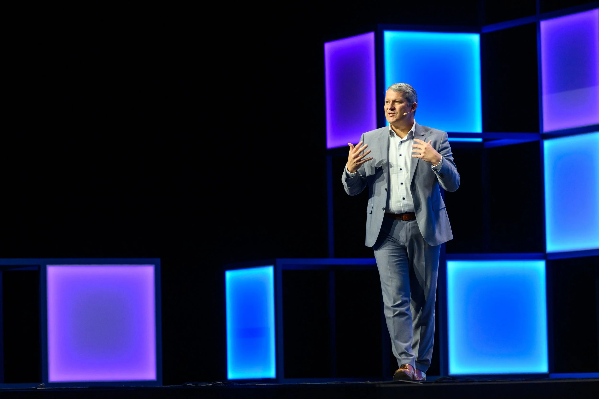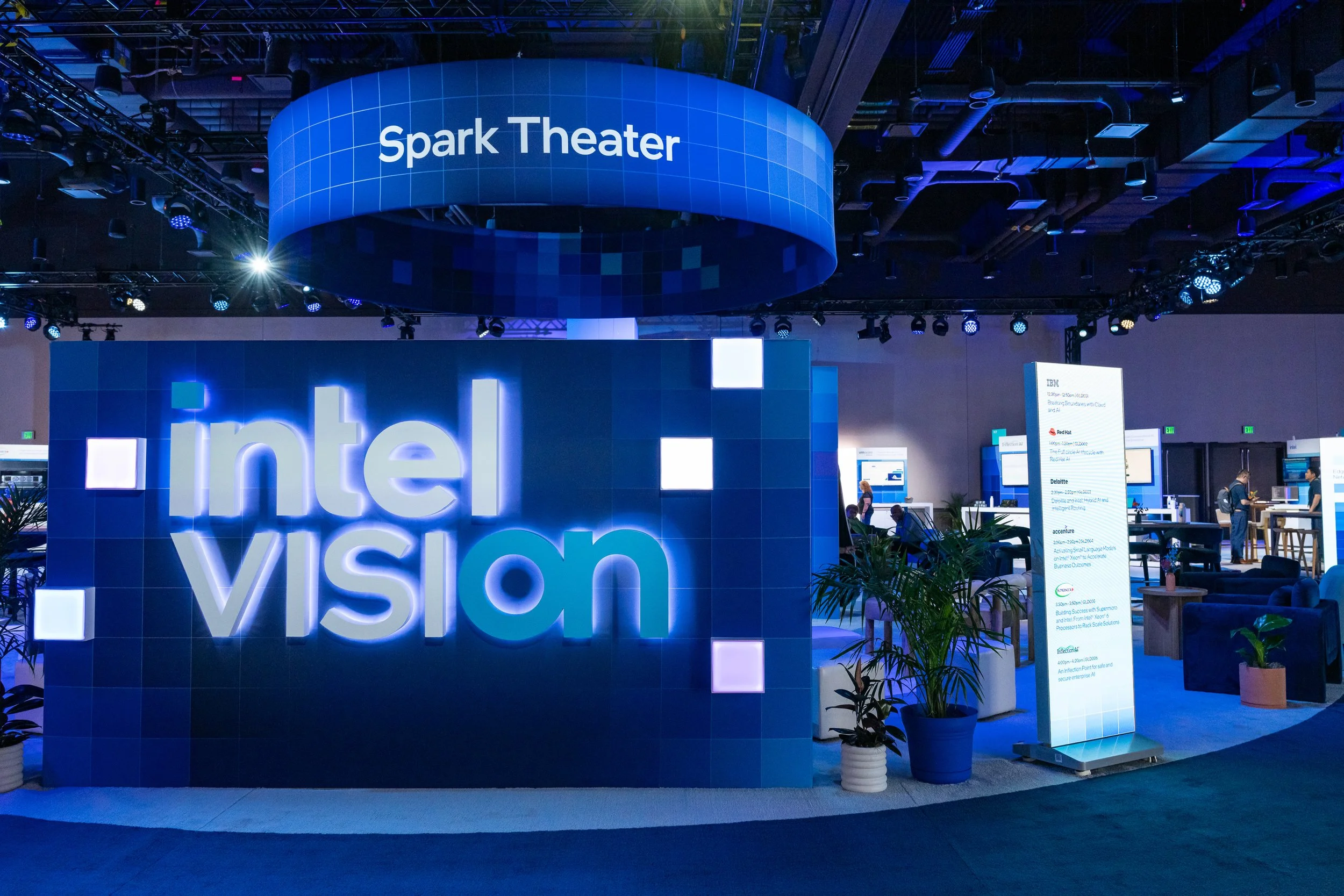 To achieve this, we reimagined the iconic Intel spark as the centerpiece of the identity, infusing it with a dynamic, gradient-based grid system that represented transformation, energy, and innovation. This modular system was applied across all touchpoints—from large-scale environmental graphics and stage design to motion assets, wayfinding, and attendee swag. The gradient grid not only anchored the event visually but also reinforced the theme of momentum and change, making the experience feel alive, future-focused, and uniquely Intel.